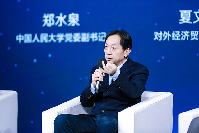 高等教育分论坛第一场圆桌论坛环节,由中国高等教育学会秘书处副秘书长王小梅主持,对话中国人民大学党委副书记郑水泉、对外经济贸易大学校长夏文斌、北京工业大学党委书记谢辉、中国劳动关系学院副校长刘玉方,以“强化思政引领,培养堂堂正正的时代新人”为主题展开讨论,分享各校的育人成效及经验。